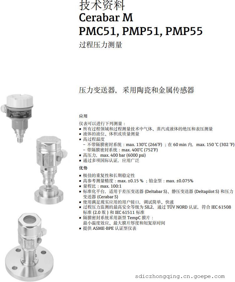 Cerabar PMP55数字式压力变送器采用金属膜片密封,主要用于过程工业和卫生行业,测量液体的压力、液位、体积和质量。PMP55专为高压和极端高温测量场合设计,*高工作温度可达400 °C(-94 ~ 750°F)。量程可调,快速设定功能节省成本和时间。符合IEC61508和IEC 61511标准,满足SIL2功能安全要求。